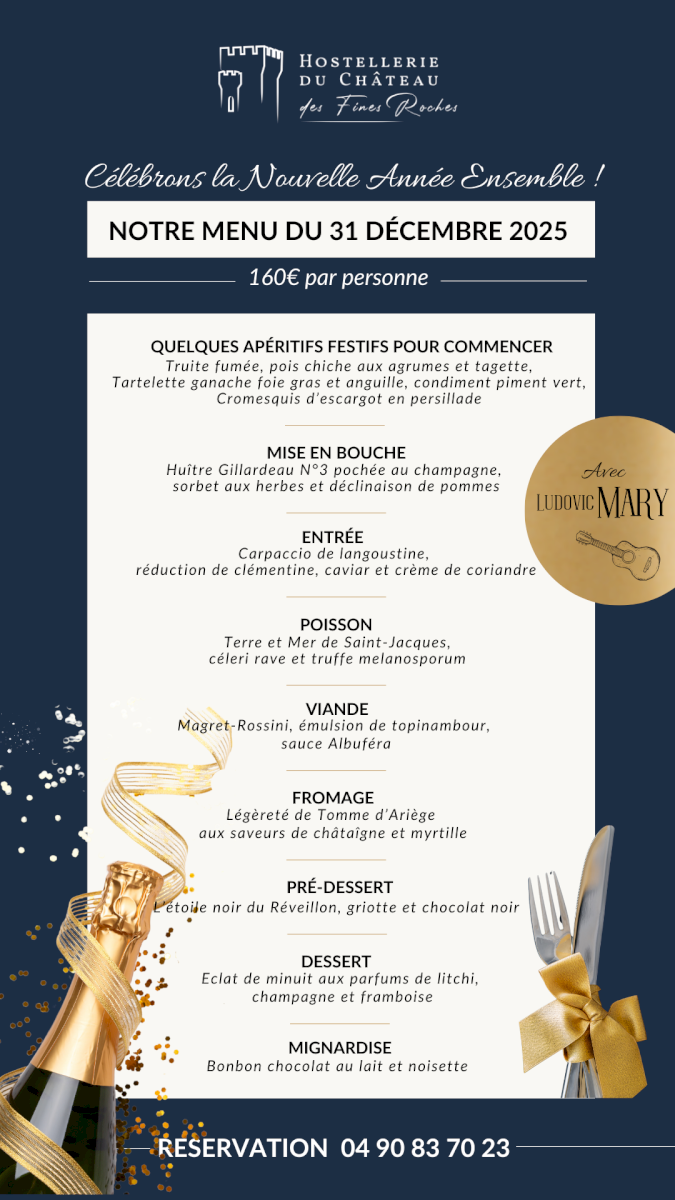 L'Hostellerie du Château des Fines Roches a le plaisir de vous recevoir pour célébrer la Saint Sylvestre. A cette occasion notre Chef Hugo LORIDAN FOMBONNE vous propose un menu gastronomique.
