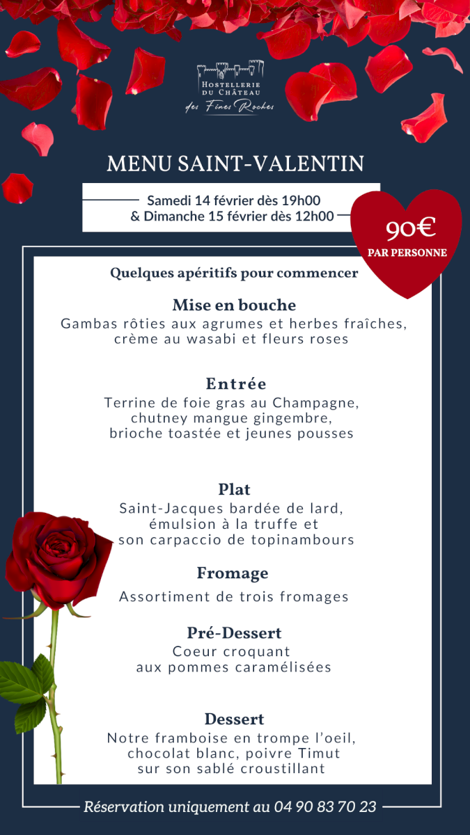 L'Hostellerie du Château des Fines Roches vous propose un menu Saint Valentin, élaboré par notre chef Hugo LORIDAN FOMBONNE.